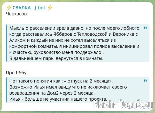 Относительно двухмесячного отпуска, который якобы взял Илья Яббаров, удивился длительности такого отдыха Черкасов. И пояснил, что, возможно, надеется саратовский шансонье на свое возвращение на телестройку через этот срок.