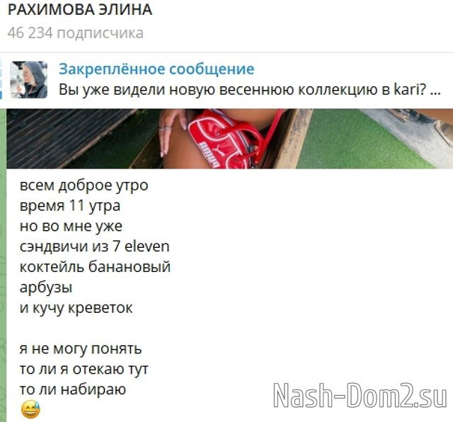 На днях стало известно, что Элина Рахимова переживает за отеки и лишний вес, но не может остановиться - еда такая вкусная, что Элина поглощает всё подряд. Сэндвичи, коктейли, арбузы, креветки - всё в топку. А потом Элина шутит, что она отекает, чтобы фанатки делали ей комплименты и уговаривали показать что-нибудь интересное, кроме танцев и еды.