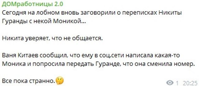 С Ваней Китаевым девушка рассталась из-за его дружбы с Никитой. Сначала некая Моника общалась с Гурандой, потом Китаеву начала интимные фото присылать, они её не поделили и правда стала известна участникам Дома-2.
