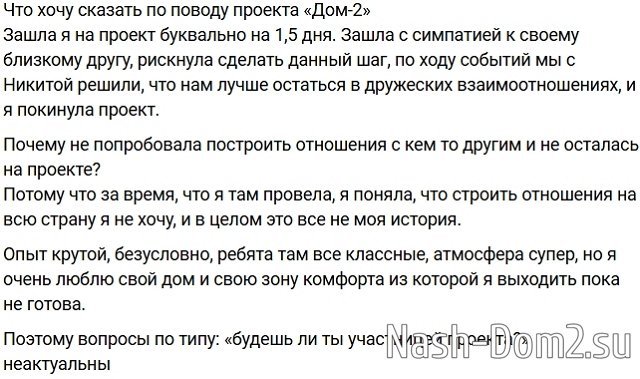 Аня рассказала о том, что она пришла на проект с симпатией к Никите, хотя они друзья, но Гуранда не захотел переходить границы и она подумала, что формат построения отношений под камерами ей не подходит.