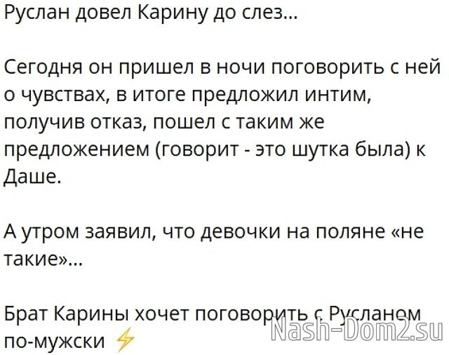 Теперь Руслану Асланову предстоят разборки с братом Карины Тетуевой, который решил по-мужски поговорить с обидчиком сестры. Если вспомнить все претензии Карины к Руслану, как она выливала ему в лицо воду и бросала одежду, то и ей нужно подумать над поведением, не только Руслану. Подробности обсудим после выхода эфиров Дома-2 11.04.2026.