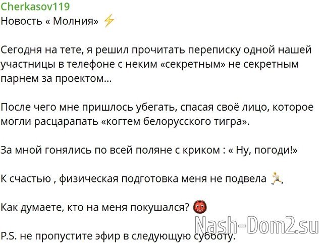 Ведущий телепроекта сообщил подписчикам о происшествии на Поляне. Страстная "тигрица" Вероника Гракович в субботу пыталась напасть на Андрея Черкасова, но он спас своё лицо от царапин и убежал от неё, перепрыгивая сугробы.